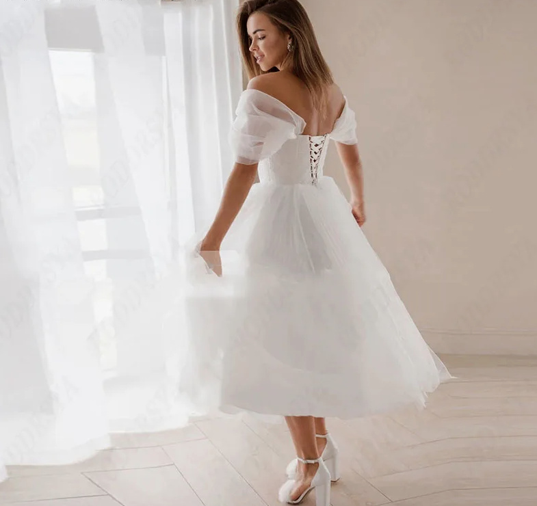 Vintage Style Wedding Dress Alicia Off Shoulder Calf Length