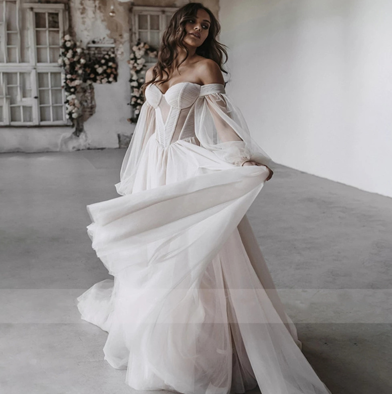 Schulterfreies Boho Brautkleid Elisabeth mit Puffärmel
