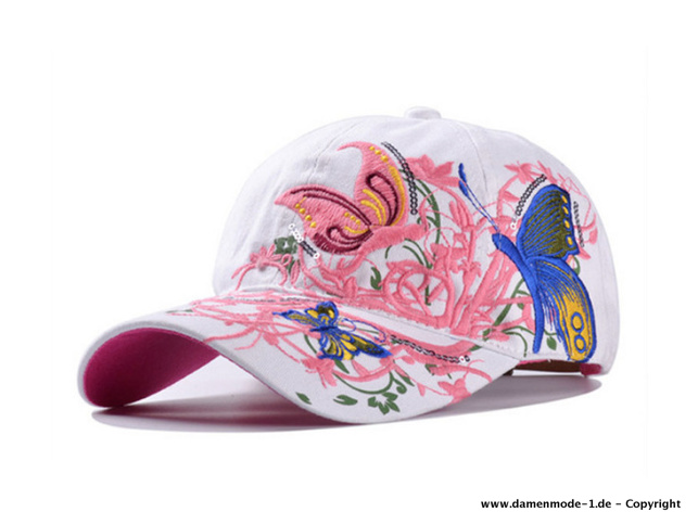 Damen Baseball Cap in Weiß mit Schmetterling Stickereien