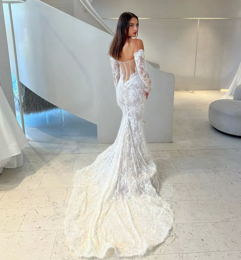 Off-the-shoulder fit and flare wedding dress 2025 Delilah made of lace backless