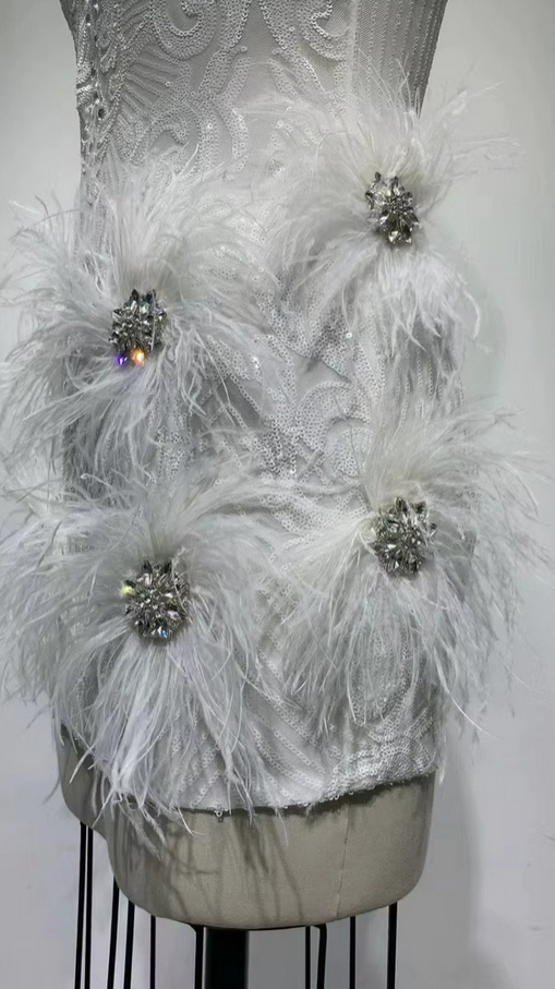 Sexy Mini Standesamtkleid Grace für die Braut mit Pailletten Diamanten und Feder Weiß