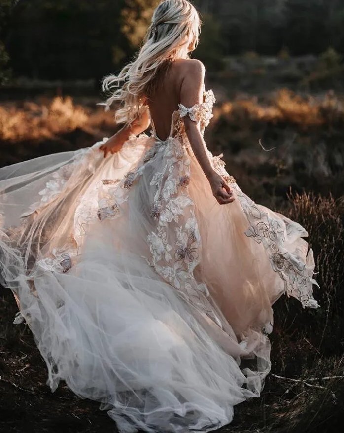 Off-the-shoulder tulle boho wedding dresses Azalea with flowers