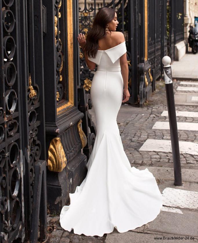 Off-the-shoulder fit and flare wedding dress Helin with brush train