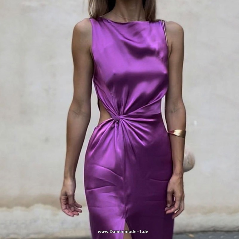 Plissee Satin Sommer Rundhals Ausschnitt Party Abendkleid