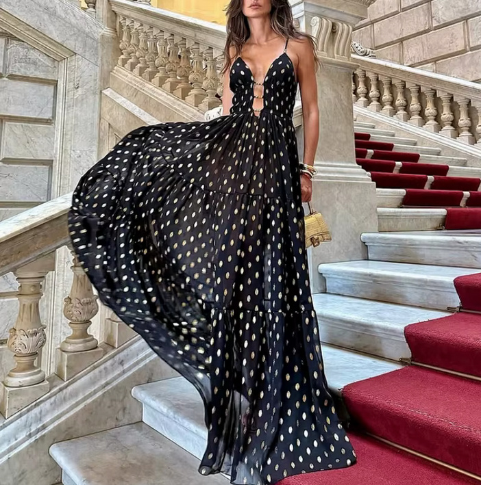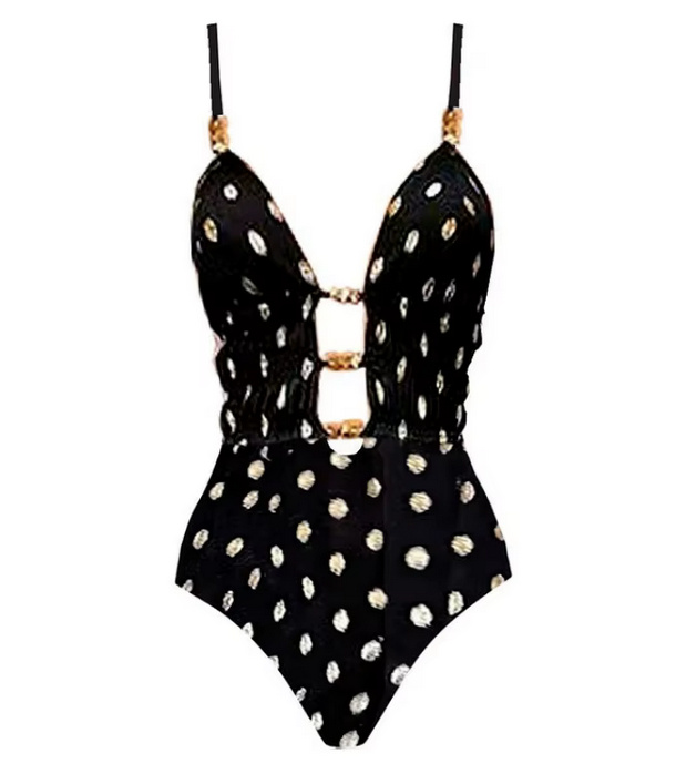 Vintage Style Pearl Swimsuit Set with Chiffon Skirt Black Polka Dot