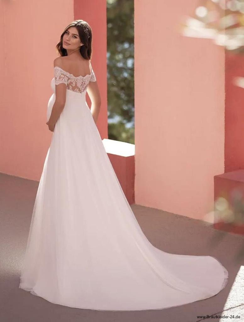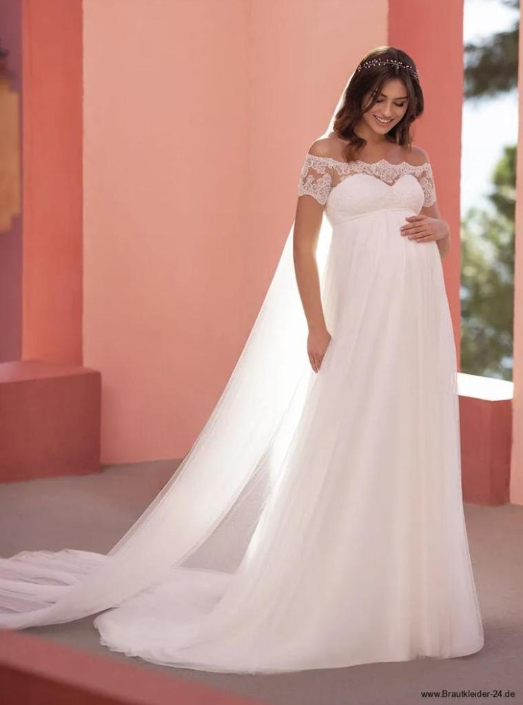 Schulterfreies Empire Brautkleid für Schwangere mit Schleppe und Spitze