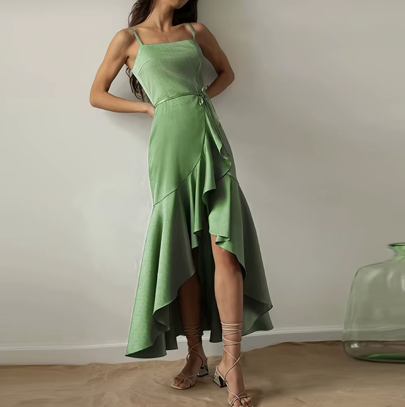 A-line spaghetti strap summer dress 2025 asymmetric with ruffles in green