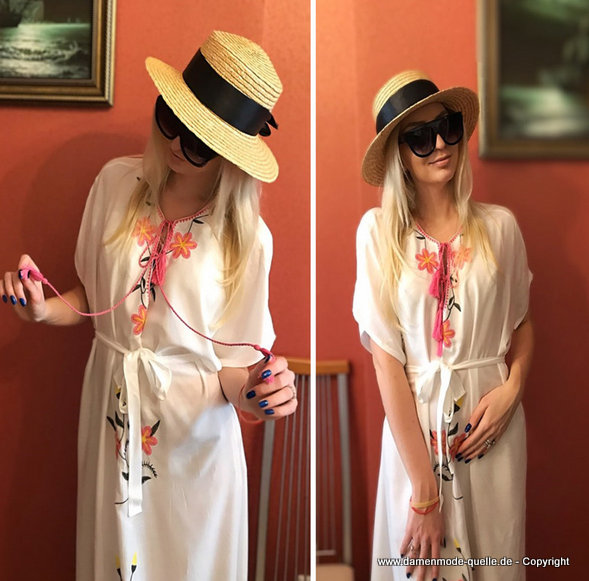 Weies Sommer Strandkleid mit Blumen Stickereien