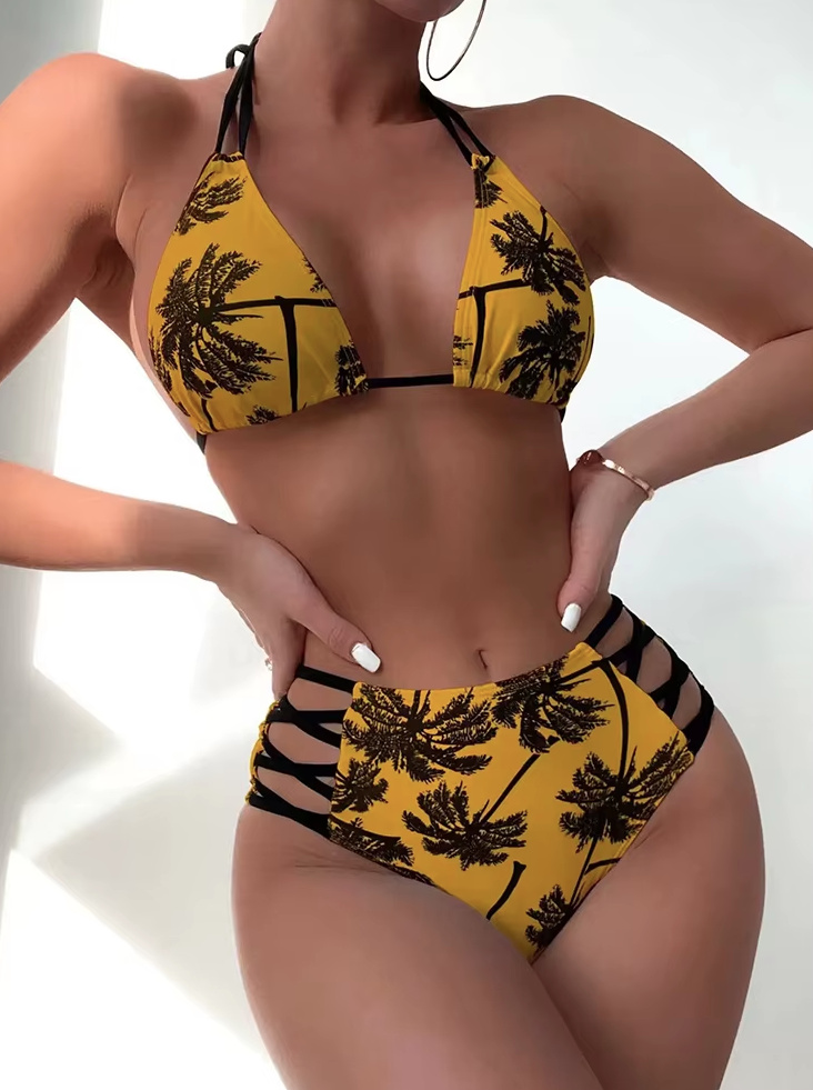 High-Waist Halterneck Bikini 2025 Yellow with Palm Pattern