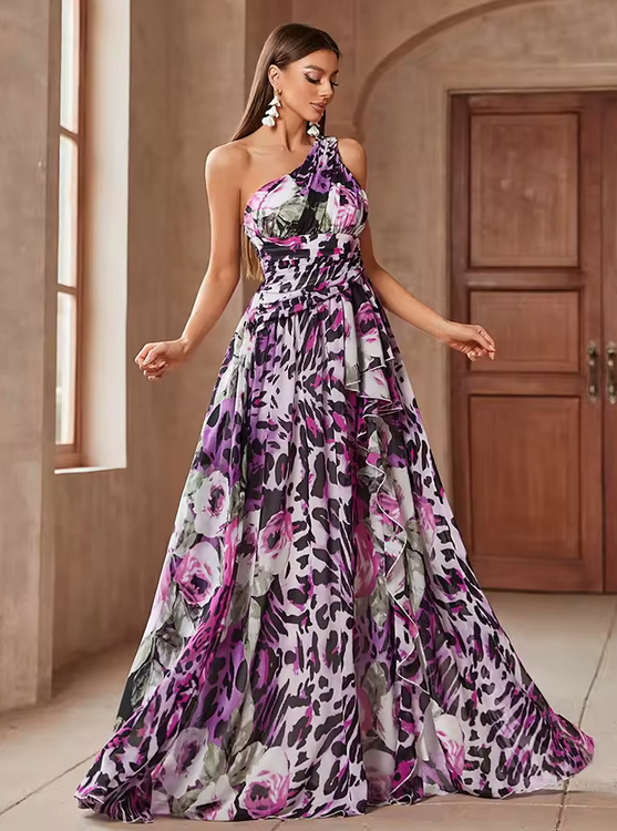 One Shoulder Dress Elegant for Wedding Guests in Purple with Floral Pattern