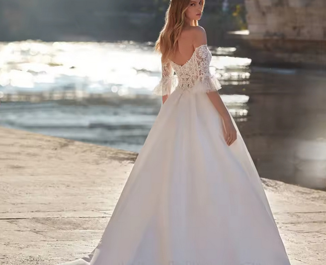 Off-the-shoulder A-line wedding dress Hendrieke with lace sleeves