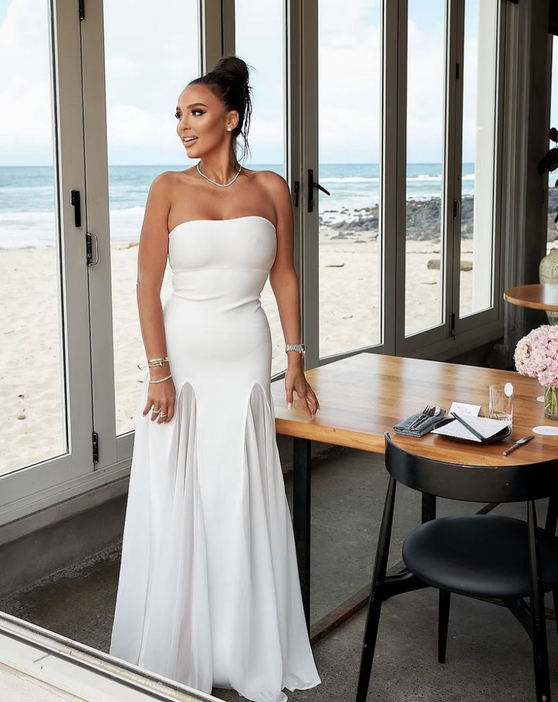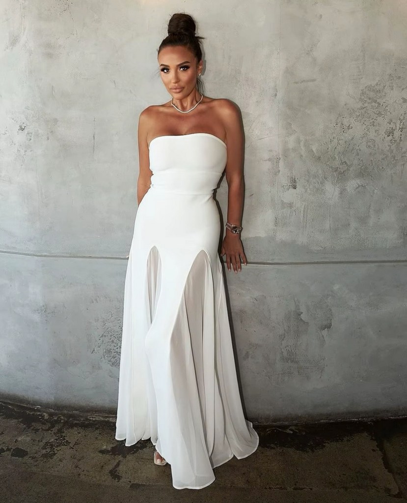 Schulterfreies A Linie Standesamtkleid Ina Lang mit Mesh Applikation