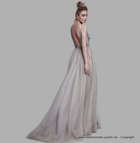 Sexy V-ausschnitt Tüll Abendkleid in Silber