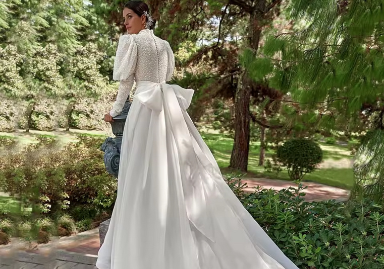 Long sleeve vintage wedding dress Hendrike with puff sleeves and pearl sequin appliqués