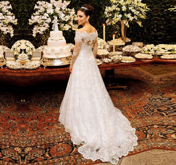 Schulterfreies Langarm Brautkleid Ivana mit Schleppe Ärmels aus Spitze