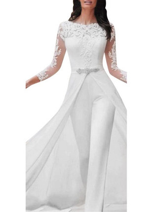 Lace Sleeve Jumpsuit Overall for the Registry Office with Train White