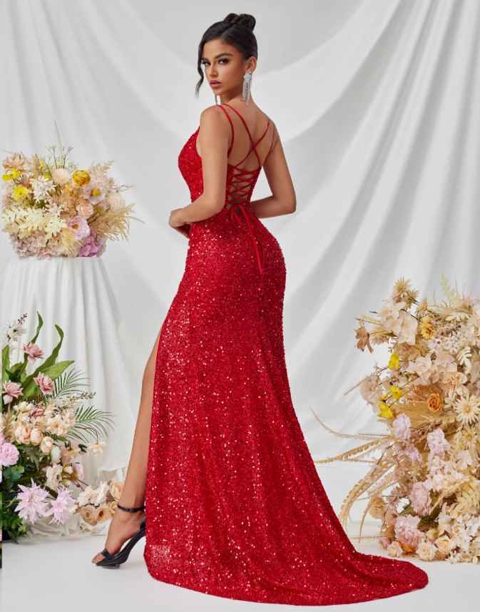 Spaghettiträger Glitzer High Cut Abendkleid Schulterfrei auch für Hochzeitsgäste in Rot