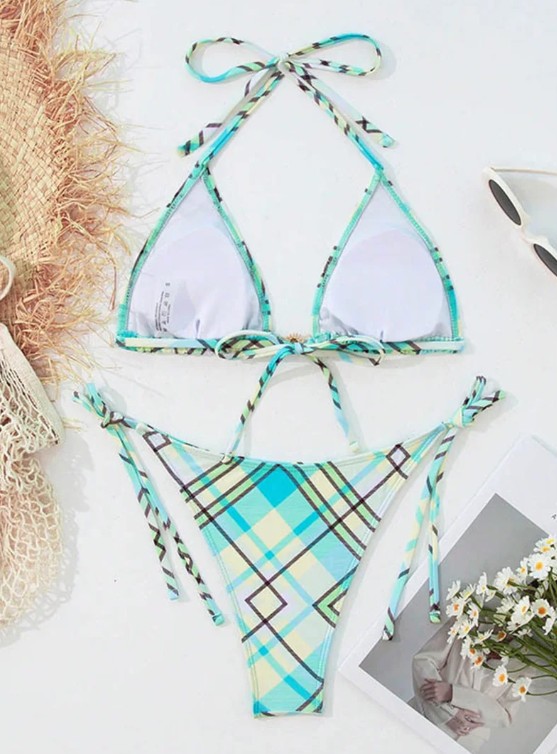 Halterneck Bikini 2025 Grün Kariert zum Binden