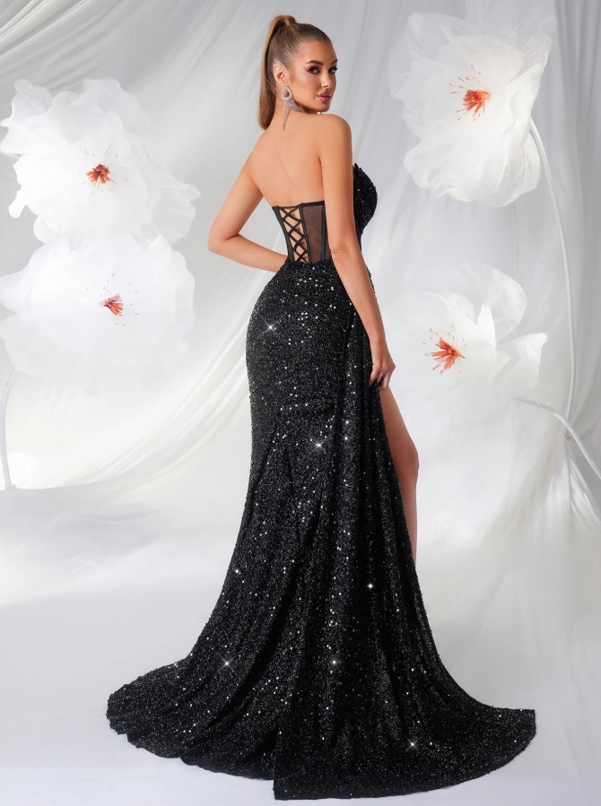 Sexy Schulterfreies Glitzer High Cut Abendkleid auch für Hochzeitsgäste in Schwarz