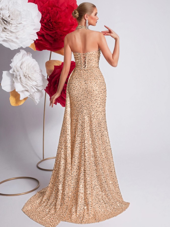 Halter strap glitter high cut evening dress sexy in champagne for wedding guests