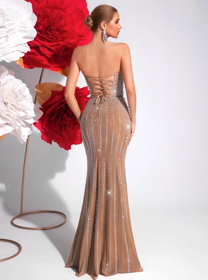 Schulterfreies Glitzer Meerjungfrau Abendkleid in Champagne für Hochzeitsgäste