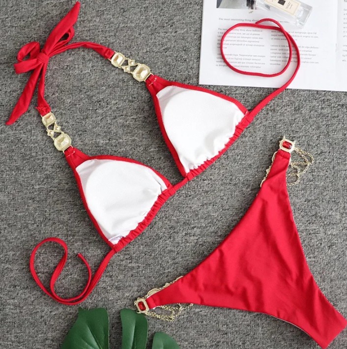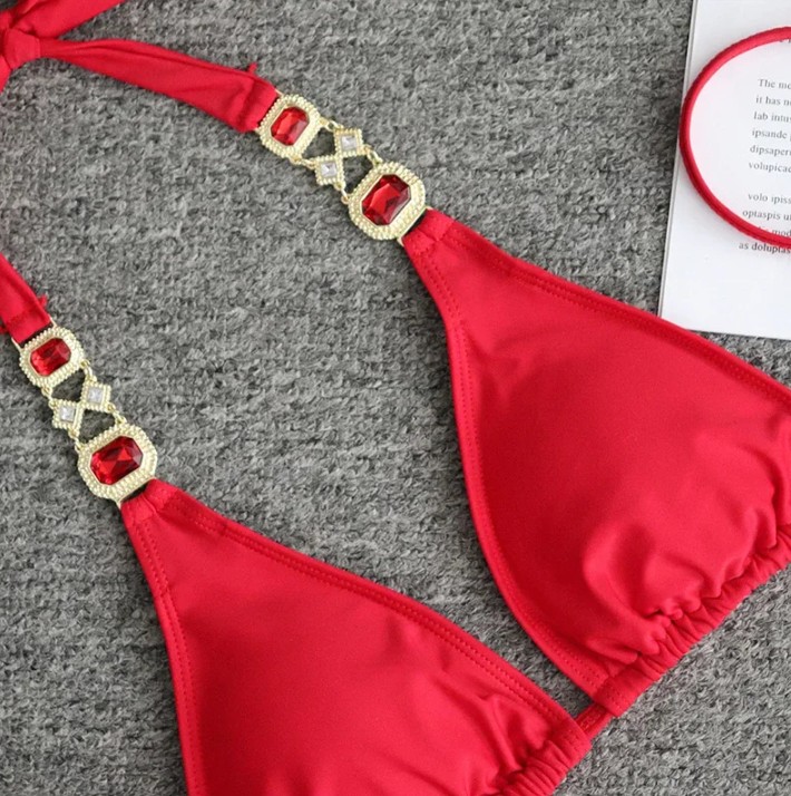 Halterneck Rhinestone Bikini 2025 Sari in Red