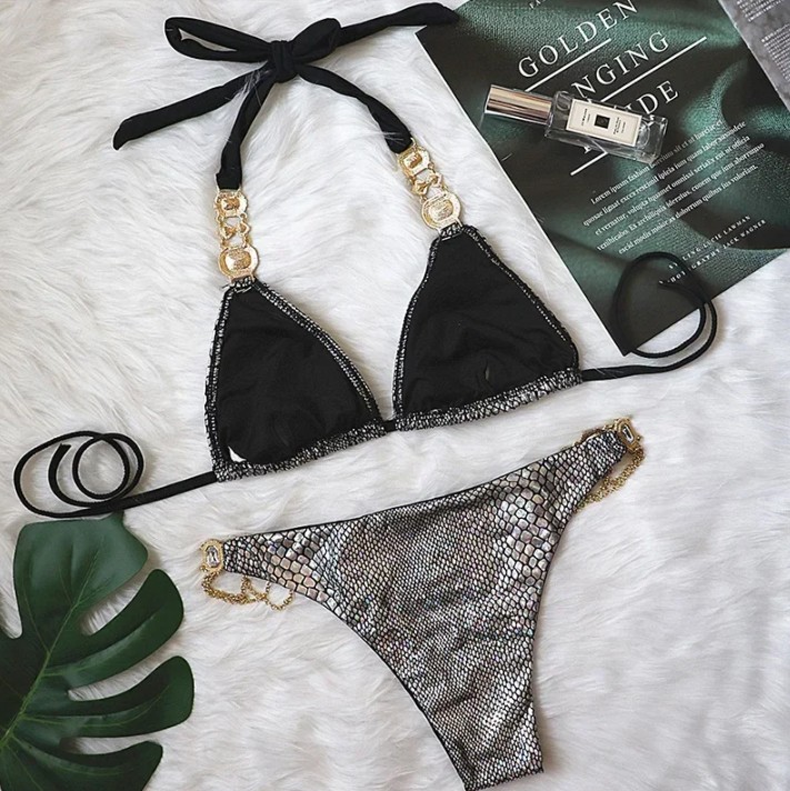 Halterneck Strass Bikini 2025 Sari in Silber mit Schlangenmuster