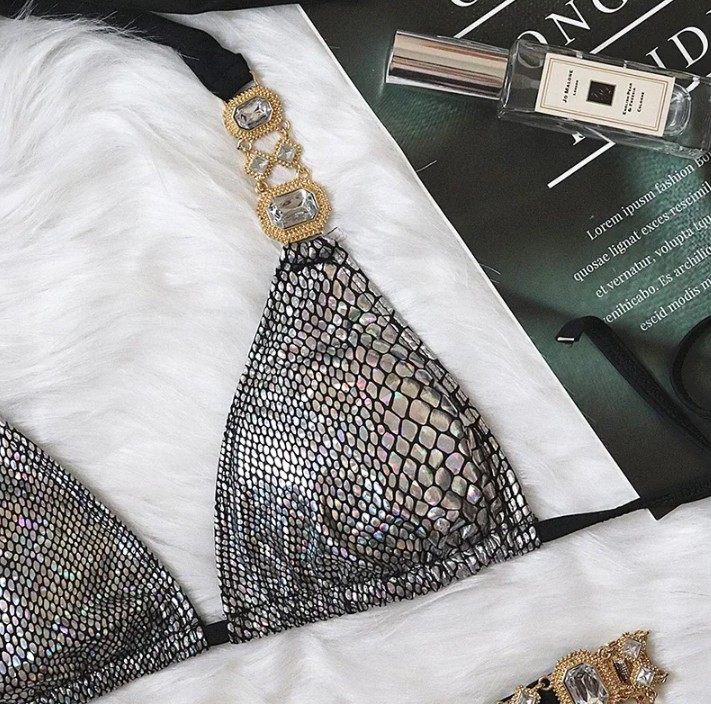 Halterneck Strass Bikini 2025 Sari in Silber mit Schlangenmuster