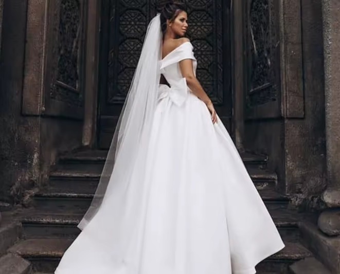 Off-the-shoulder A-line wedding dress Heike with bow