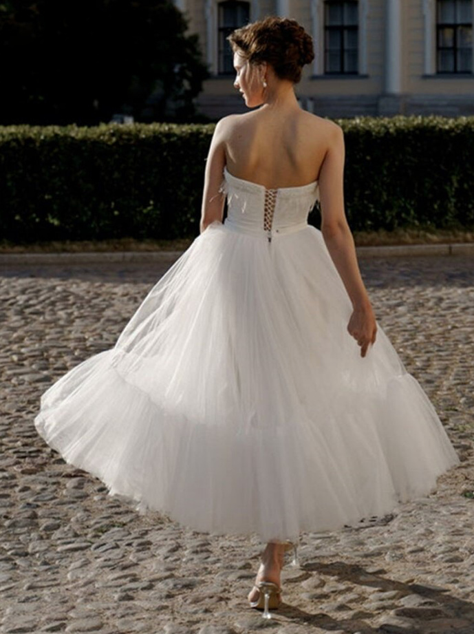 Schulterfreies Petticoat Style Brautkleid Knöchellang