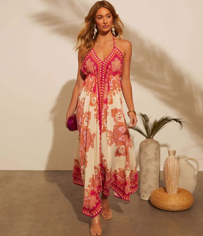 A Linie Spaghettiträger Boho Sommerkleid 2025 Lang Rot