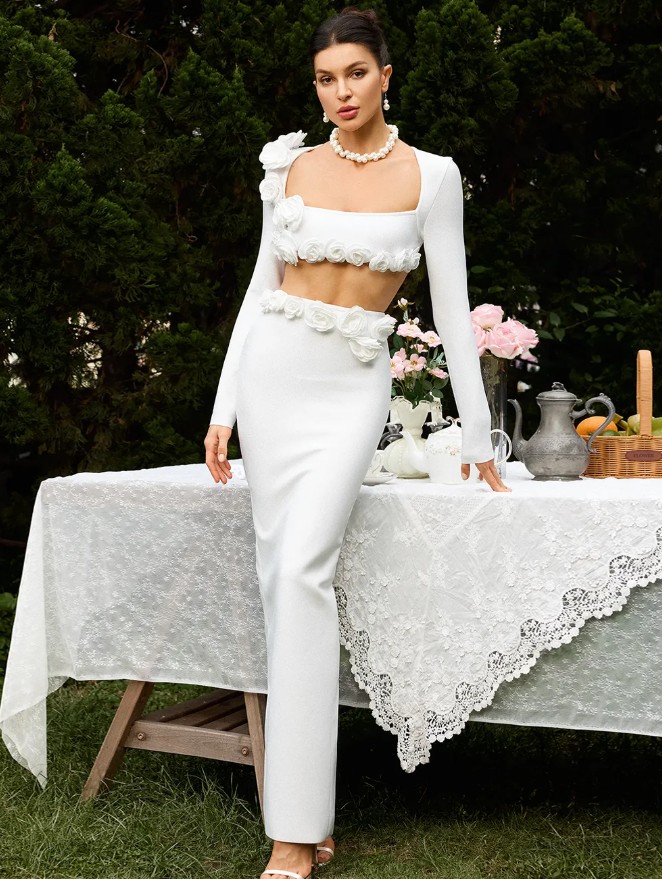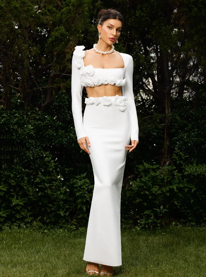 Sexy Braut Zweiteiler für das Standesamt mit 3D Blumen Weiß