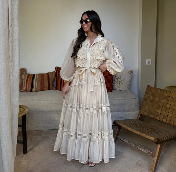 Boho Style Summer Dress 2025 with Lantern Sleeves and Lace Ivory