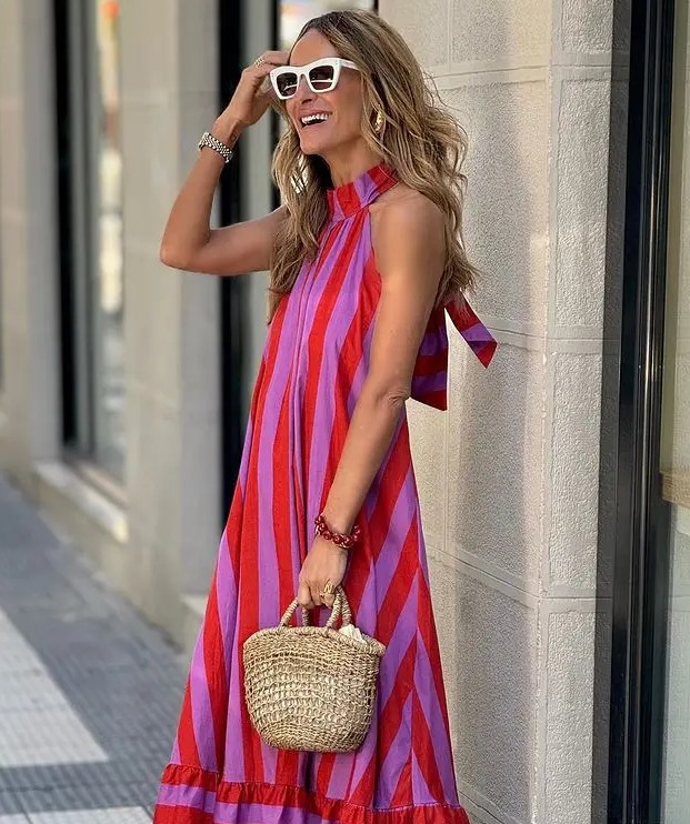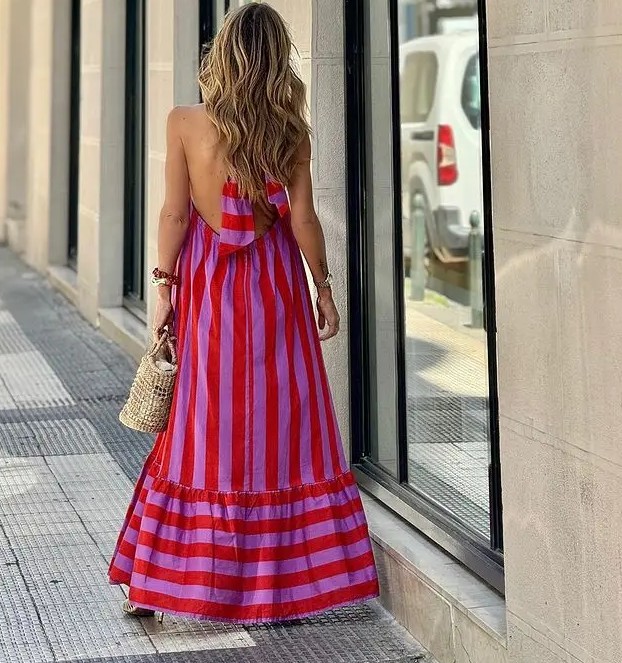 Halterneck Maxi Summer Dress Backless Pink Striped