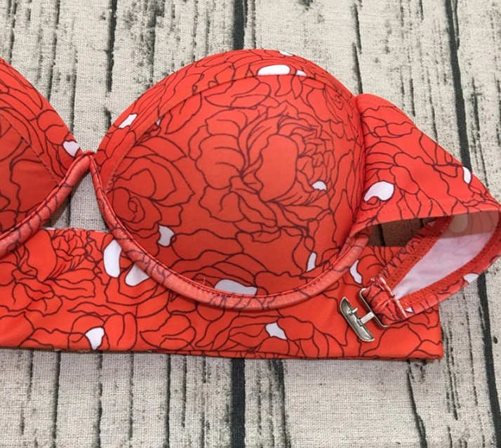 Bandeau Push Up Bikini Sigrid in red with floral pattern