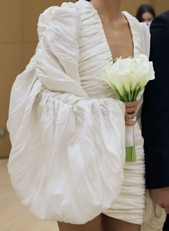 Pencil Taffeta Wedding Dress Daliah Pleated with Sexy V Neck and Oversize Sleeves