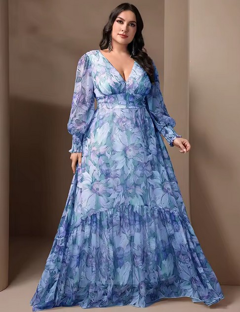 A-line long-sleeved chiffon dress Edgarda Elegant in blue with pattern