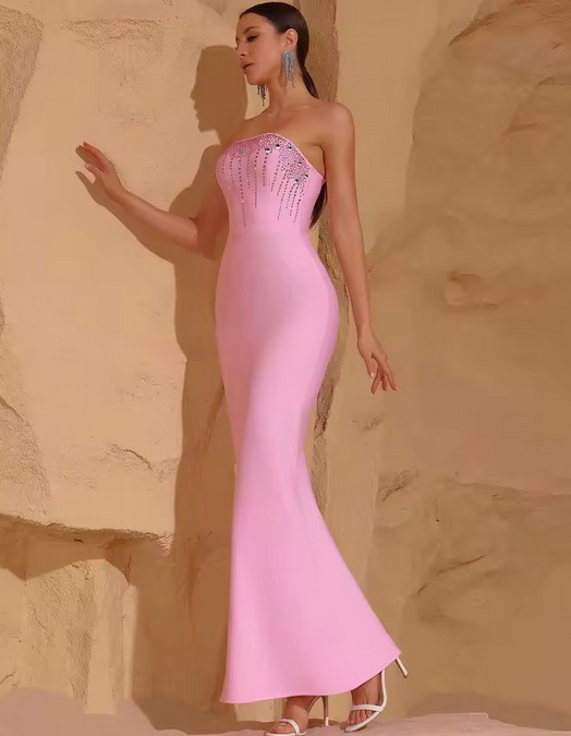 Off-the-shoulder mermaid evening dress in pink with rhinestones