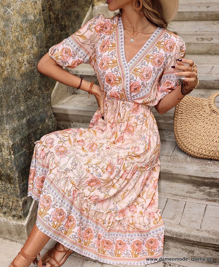 Sommer Boho Kleid Damen Retro Elegantes Rosa V-ausschnitt Kurzarm Kleid