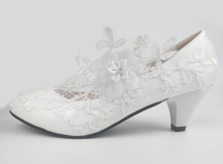 Pfennig Absatz Brautschuhe Helma Pumps in Weiß mit Spitze und Blume