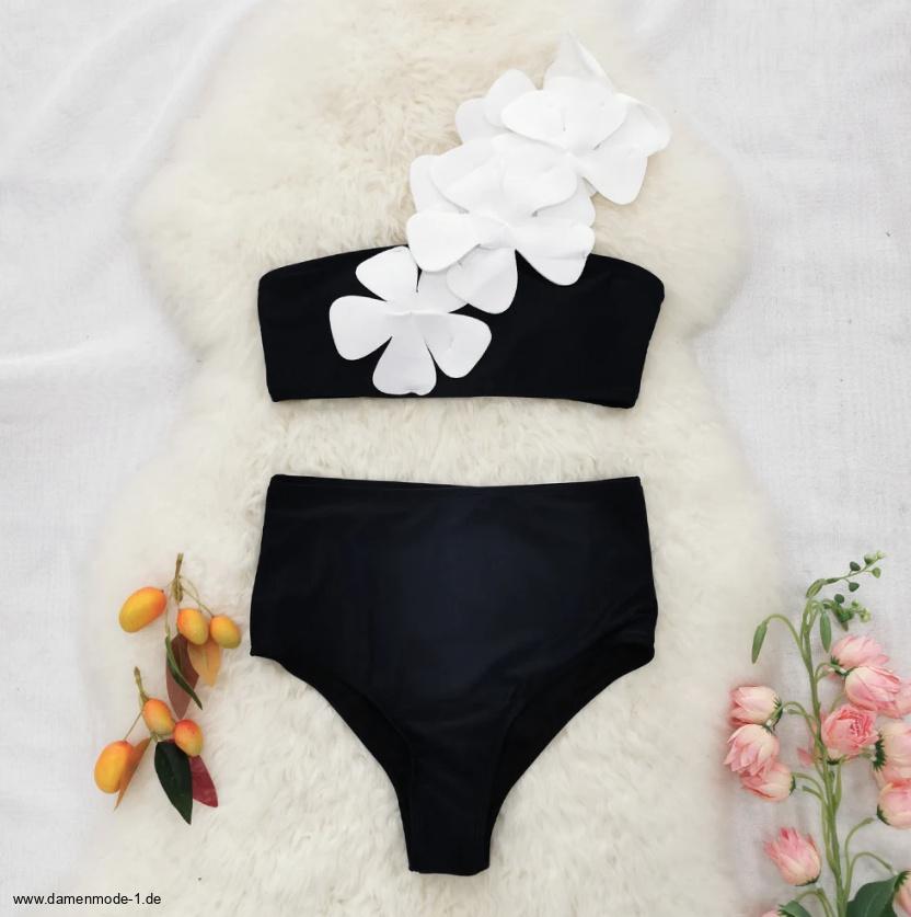 One Shoulder Träger Bikini mit Blumen Schwarz Weiß