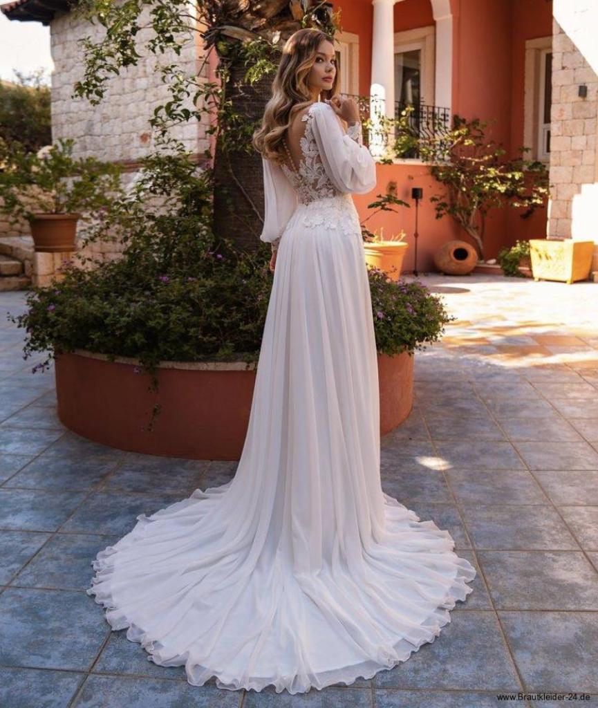 Langarm Boho Chiffon Brautkleid Gillian mit Puff Ärmel und Spitze