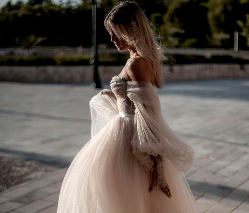 Off-the-shoulder long-sleeved boho tulle wedding dress Cathleen