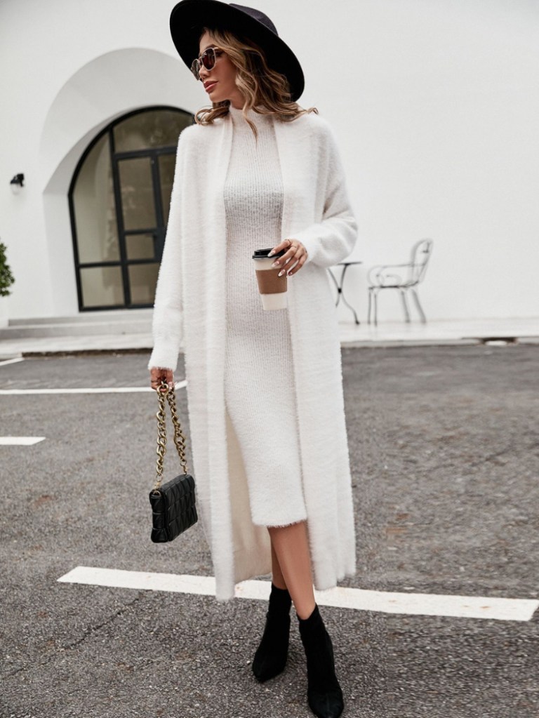 Autumn Winter Outfits Women Set Pencil Dress with Cardigan White
