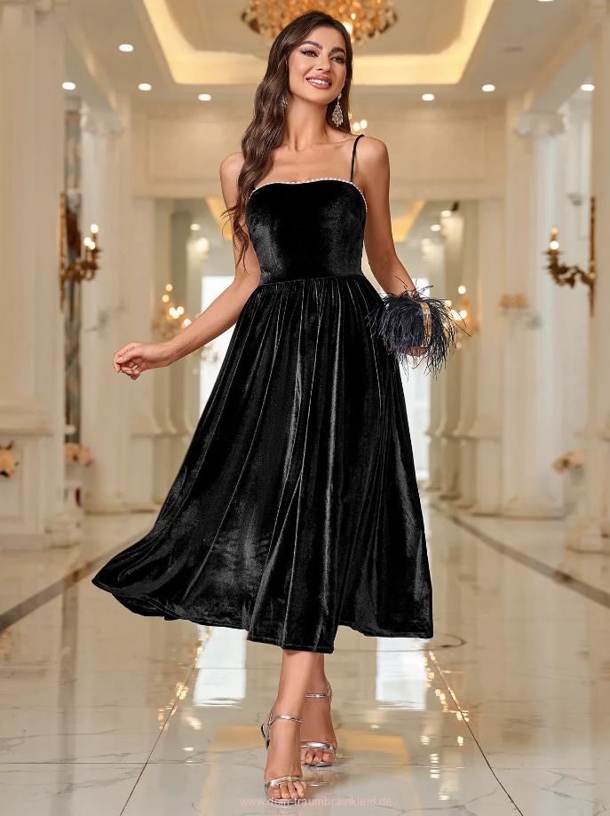 Spaghettiträger Samt Kleid Elegant für Hochzeitsgäste in Schwarz Wadenlang