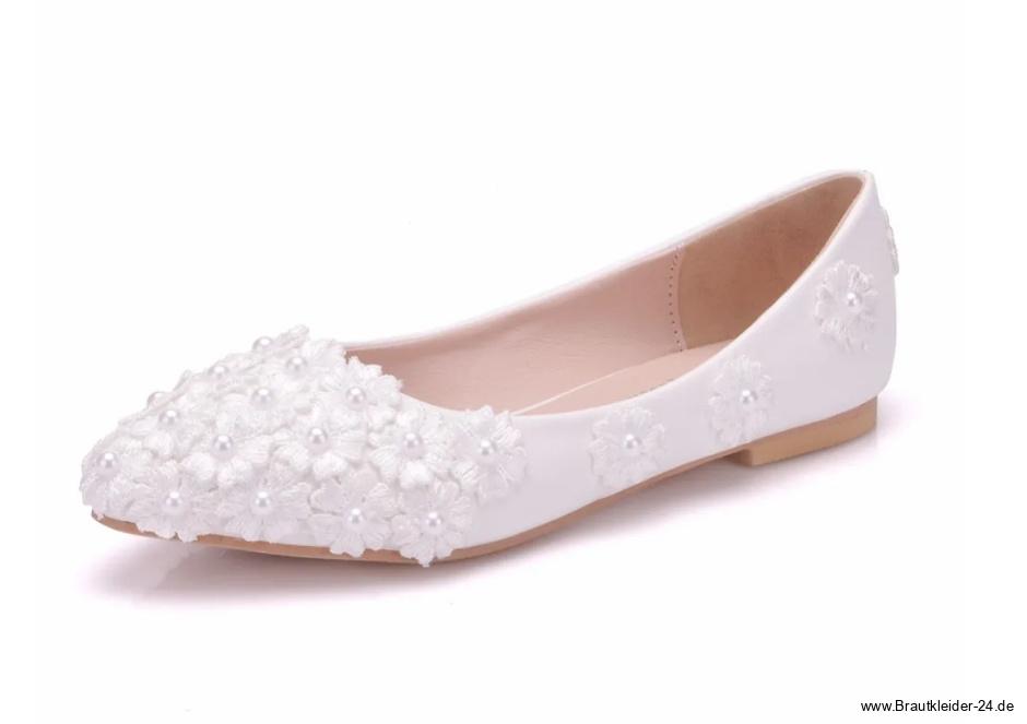 Ballerinas Flache Brautschuhe Kiara in Weiß mit Blumen und Perlen