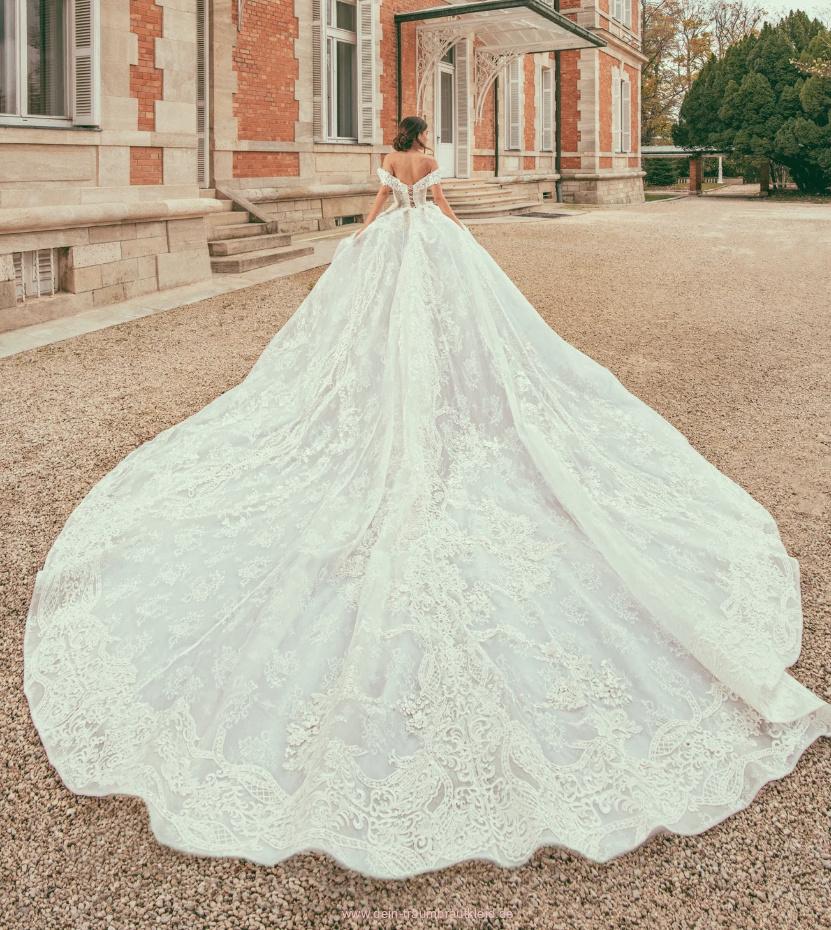 Schulterfreies Prinzessinnnen Brautkleid Aliena miit Stickereien Spitze und Kathedral Schleppe