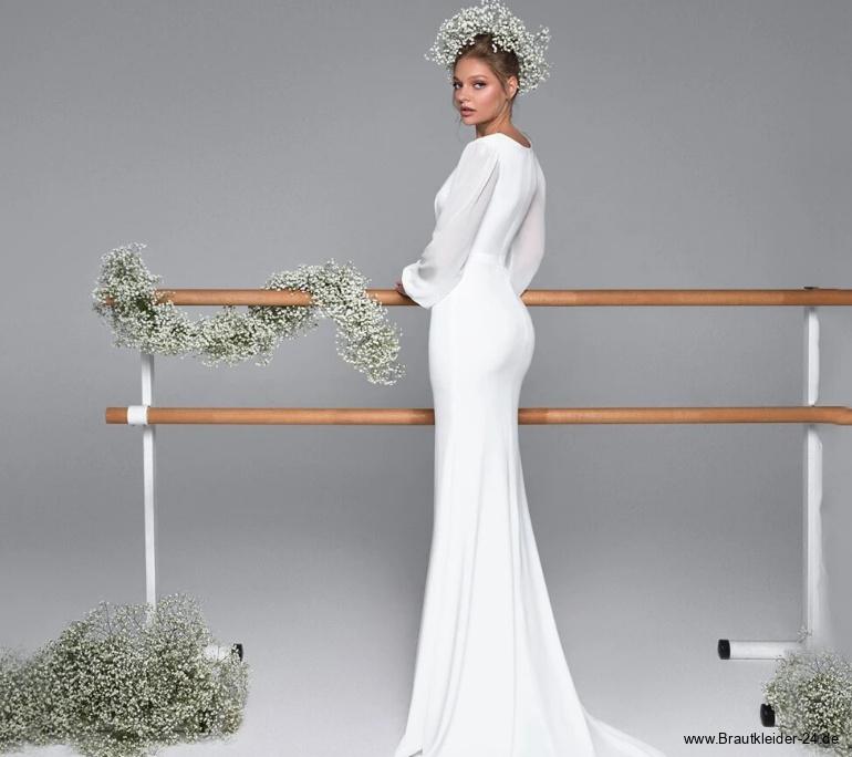 Langarm Meerjungfrau Brautkleid Kalama mit V Ausschnitt und Schleppe