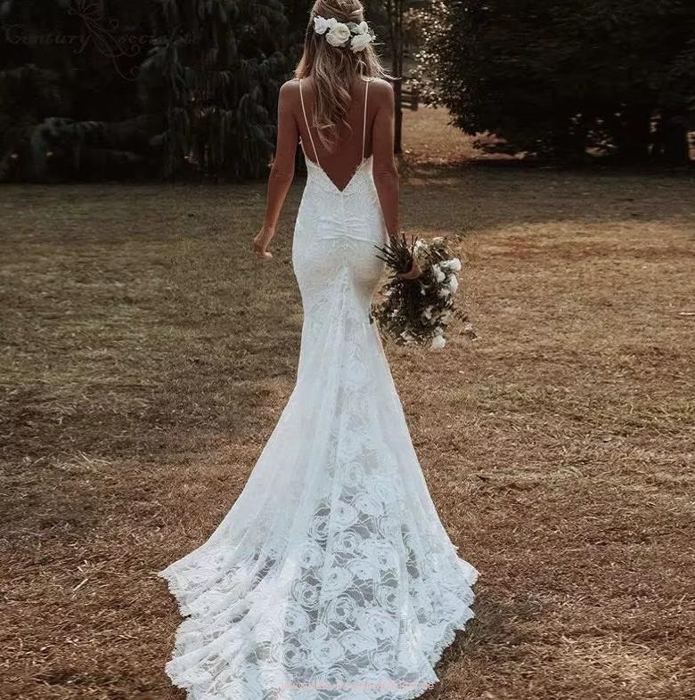 Boho Style Fit and Flare Wedding Dress Britany with Spaghetti Straps Train and Lace