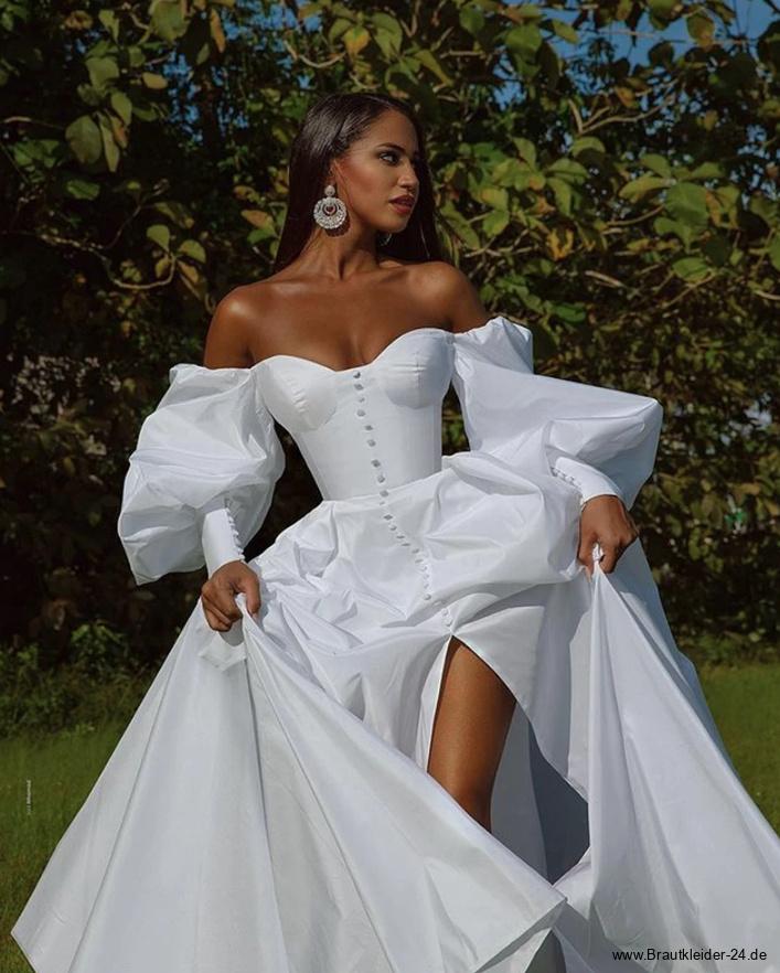 Schulterfreies Boho Langarm Brautkleid Laren mit Puffärmel und Knöpfe